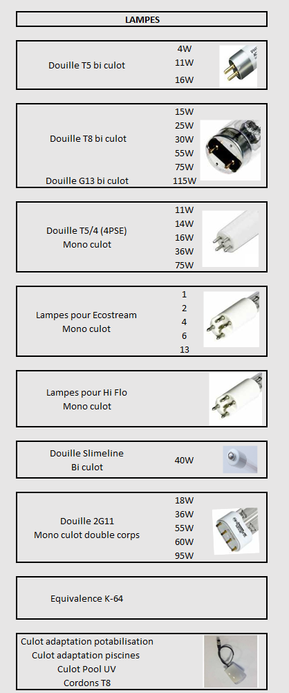- Lampes UVc : modèles T5, T8, slimline, 2G11, ainsi que les lampes spécifiques aux gammes ECOSTREAM et HiFlo, disponibles dans de nombreuses puissances (4W à 115W).