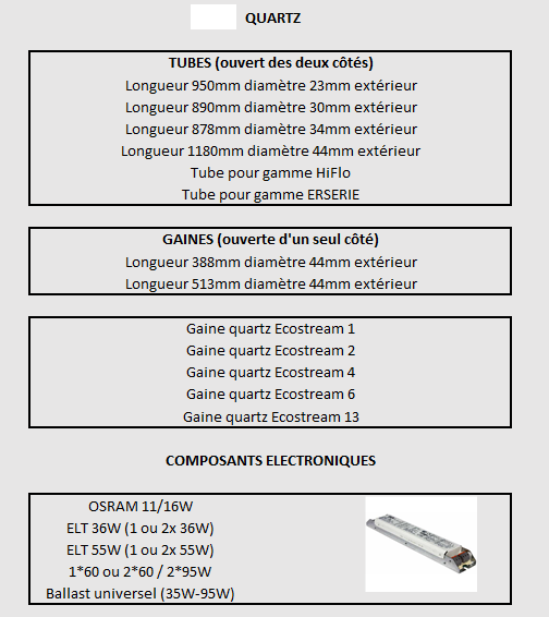 - Composants électroniques : ballasts OSRAM, ELT et universels, cellules UVc-mètre, cordons d’alimentation et adaptateurs spécifiques.